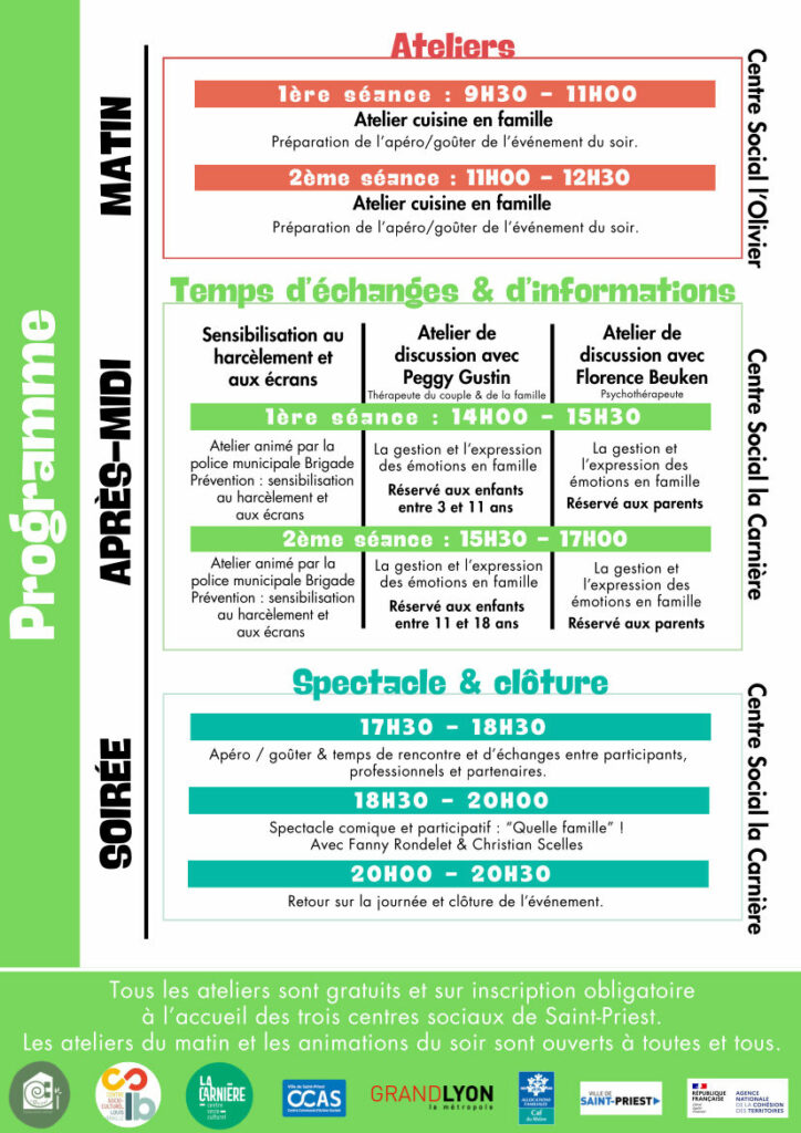 - 14h à 17h : des temps d’échanges sur la gestion et l’expression des émotions en famille (animés par des professionnels) et une sensibilisation au harcèlement et aux écrans présentée par la police municipale Brigade prévention de St Priest.