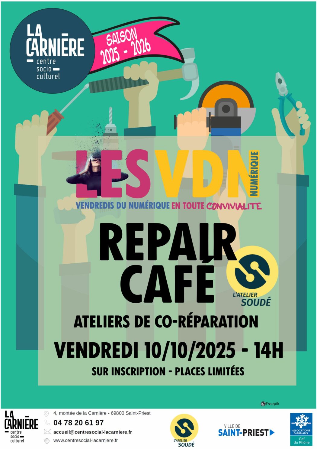Dans le cadre des Vendredis du Numérique, le centre social vous propose une après midi Repair Café avec l’association L’atelier Soudé. L’objectif de cette après midi est d’apprendre ensemble comment réparer des petits appareils (électroménager, informatique, luminaire, outillage électroportatif, hifi, console/manette). Sur inscription jusqu’au jeudi 9 octobre, à l’accueil du centre social. Places limitées.
